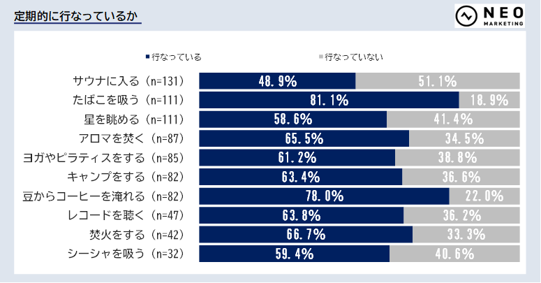 | ■リラックス・息抜きのための行動が大切だと思うと計78.6%が回答。約4割が「チル」、「ととのう」ために行動した経験あり ■「チル(チルアウト)」・「ととのう」ための行動。男性は「サウナ」、女性は「ヨガやピラティス」が第1位 ■サウナやキャンプ、「チル」や「ととのう」ブームで再注目 ■サウナは「おじさんのもの」から「若者に人気」、キャンプは「大人数」から「1人でも楽しめる」。休息系趣味・娯楽のイメージが変化 ■2人に1人が休息系趣味・娯楽を今後も楽しみたいと回答。今後も若者中心に、休息系趣味・娯楽のブームは続く見通し |