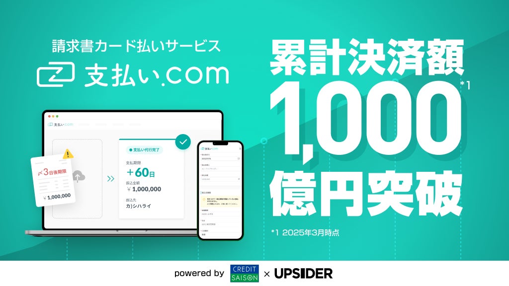 株式会社クレディセゾン(本社:東京都豊島区、代表取締役兼社長執行役員COO :水野 克己、以下:当社)と株式会社UPSIDER(本社:東京都港区、代表取締役:宮城 徹・水野 智規)が共同で提供する請求書カード払いサービス「支払い.com」(以下:支払い.com)は、2025年3月時点で累計決済額が1,000億円を突破したことをお知らせいたします。