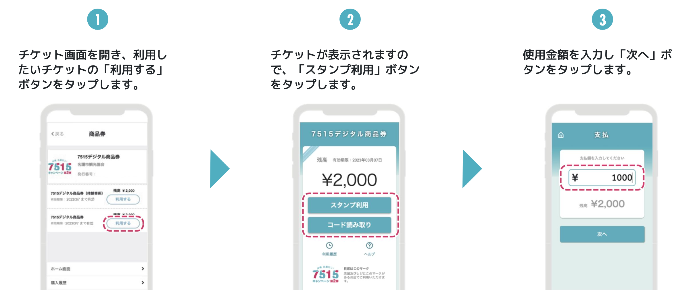 「7515デジタル商品券」購入後は、名護市内の宿泊施設内の飲食店や小売店、観光施設、公共交通機関等の加盟店、全85店舗(2023年1月5日(木)時点)で利用可能で、うち2,000円分は市内31箇所(2023年1月5日(木)時点)の体験施設が利用対象となります。本券の受け取り・利用の際には、アプリなどのダウンロードは必要なく、加盟店での会計時に1円単位で利用いただけます。「7515デジタル商品券」の決済方法は、「二次元コード認証(静的MPM方式)」と「giftee STAMP」(※4)の2種類があり、タクシー利用時のみ「二次元コード認証」となります。タクシー利用時にお手持ちのスマートフォンで、「7515デジタル商品券」の二次元コード読み取り画面から、車内に設置された二次元コードを読み取った後、使用金額を入力・確定し、運転手に支払い完了画面を提示することで支払が完了します。その他の加盟店で利用する場合は、利用したい金額を利用者がスマートフォンに入力し、入力後に表示される「7515デジタル商品券」の券面に、加盟店が電子スタンプ「giftee STAMP」を押印することで支払が完了します。両決済においても、支払完了時に「消し込み」という処理が行われ、そのタイミングで利用済みのチケットとして認識されるため、再利用等の不正利用を防ぐことができます。なお、紙の商品券の運用時に発生する「受領・裏書・集計・保管・請求」といった加盟店の煩雑な作業も必要なく、利用実績等も専用のWEBページから加盟店毎に確認することが可能です。利用実績が全て自動でデータ化されるため、加盟店における裏書や集計、請求が不要であり入金を含む精算作業にかかる時間を短縮することができ、飲食店や小売店等の中小事業者の迅速な経済支援の実現を可能とします。