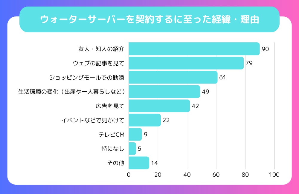 ウォーターサーバーを契約するに至った理由として「友人・知人の紹介」が24.3%で最多、「ウェブの記事を見て」が21.3%で2番目に多く、「ショッピングモールでの勧誘」が16.4%で3番目に多い結果となった