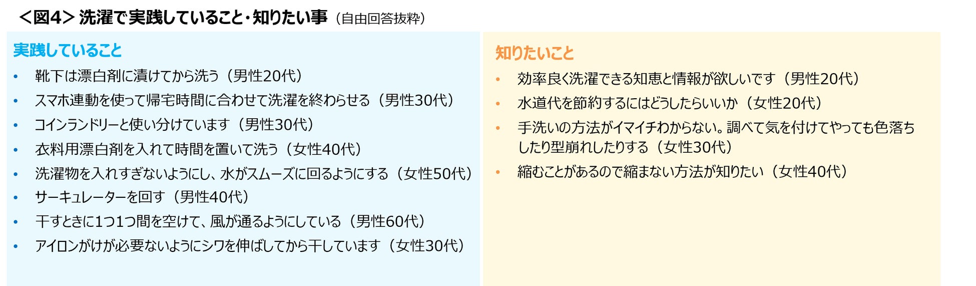 洗濯に関して実践していることとしては、女性は「仕上がり」、男性は「効率」に関心あり。 女性は型崩れやしわなど仕上がりを気にかけ洗濯・物干しをするのに対し、男性はコインランドリーを利用したりスマホを連動させて帰宅時間に合わせて洗濯するなど、効率性を重視する傾向がうかがえる。知りたい事としては、部屋干しのニオイ予防や洗濯槽の汚れの取り方などは男女共通して聞かれたが、やはり男性は効率のいい洗濯方法、女性からはオシャレ着の扱い方法を知りたいというように、違いが見受けられた。<図4>