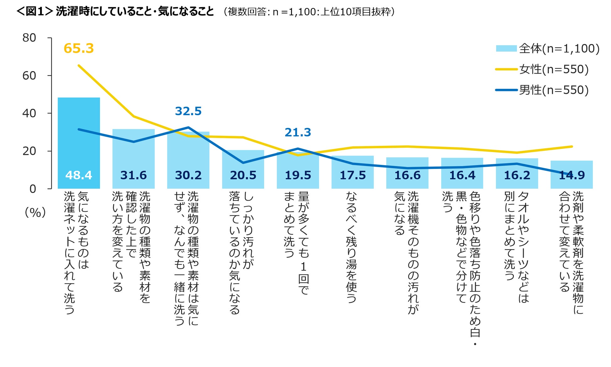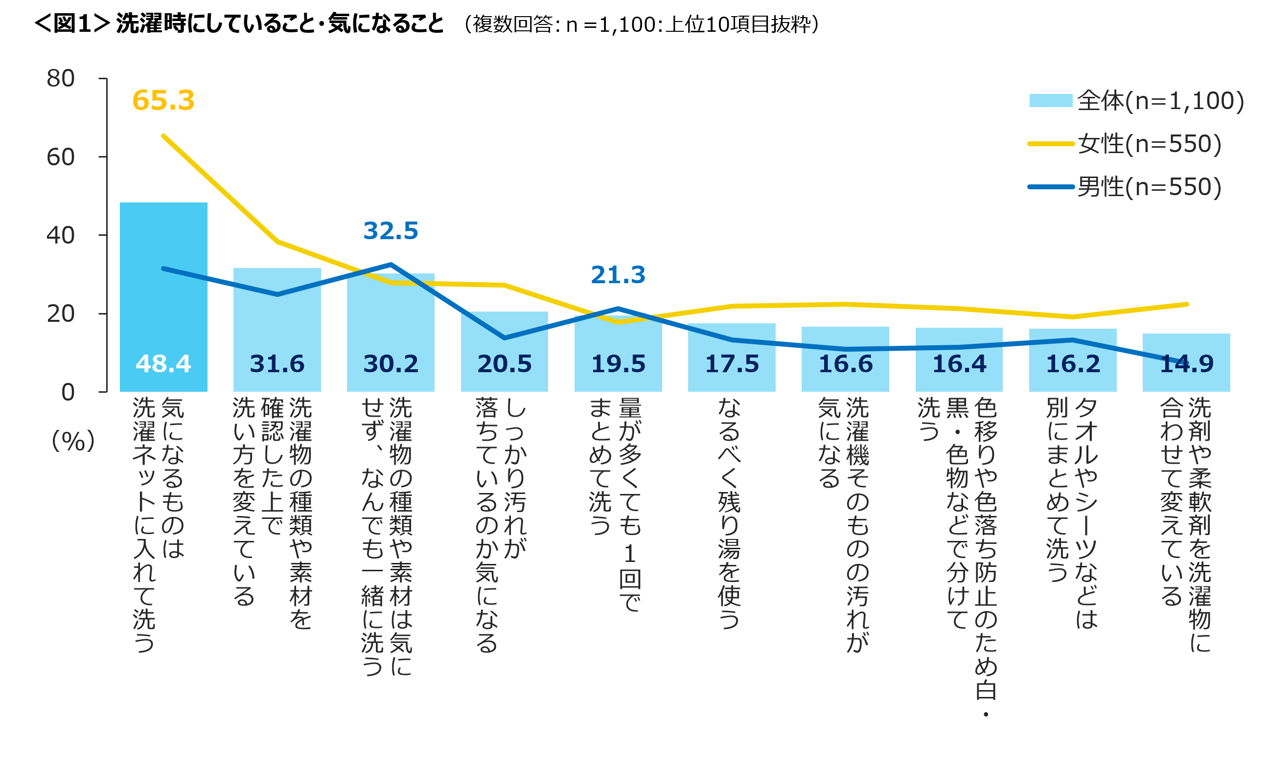 洗濯時にしていることは「気になるものは、ネットを使う」割合が48.4%。 特に女性では65.3%がネットを利用。一方、男性では「洗濯物の種類や素材を気にせず、なんでも一緒に洗う」「量が多くても1回でまとめて洗う」が高く、女性ほどこだわりや気にかけていることは少ない。<図1>