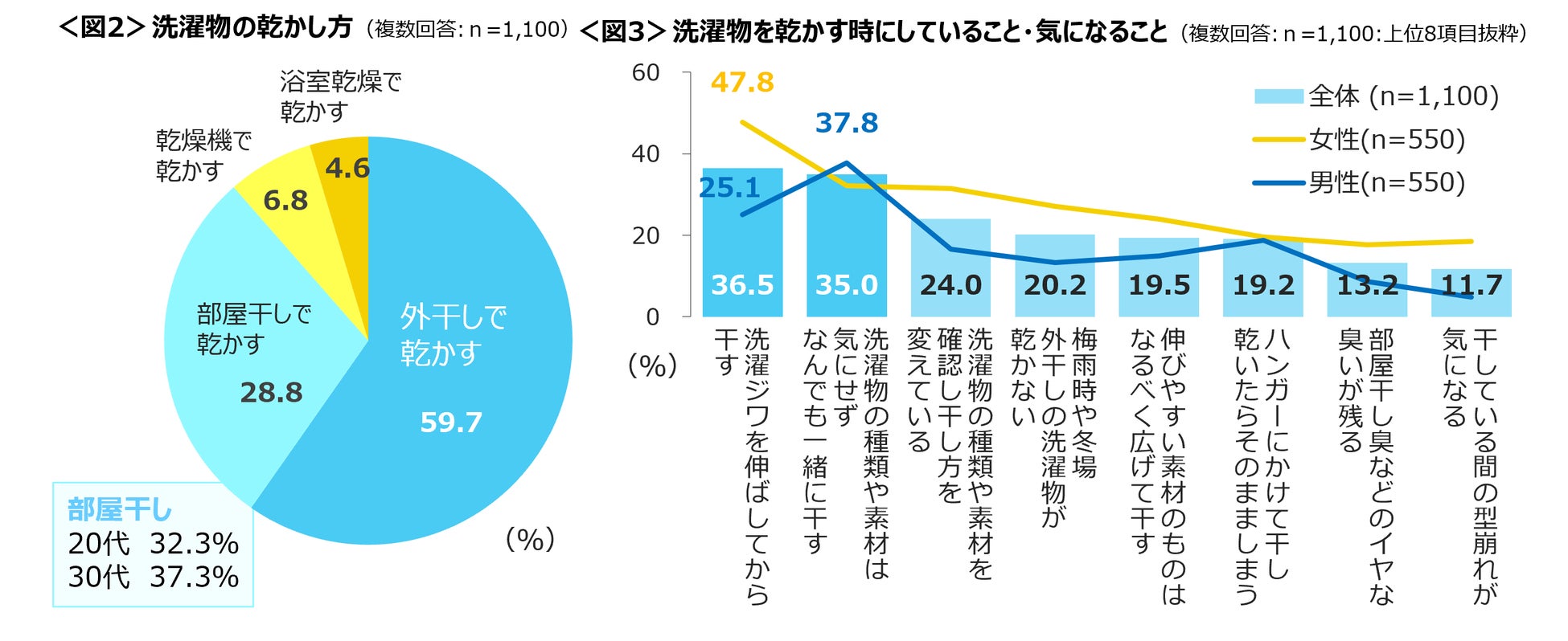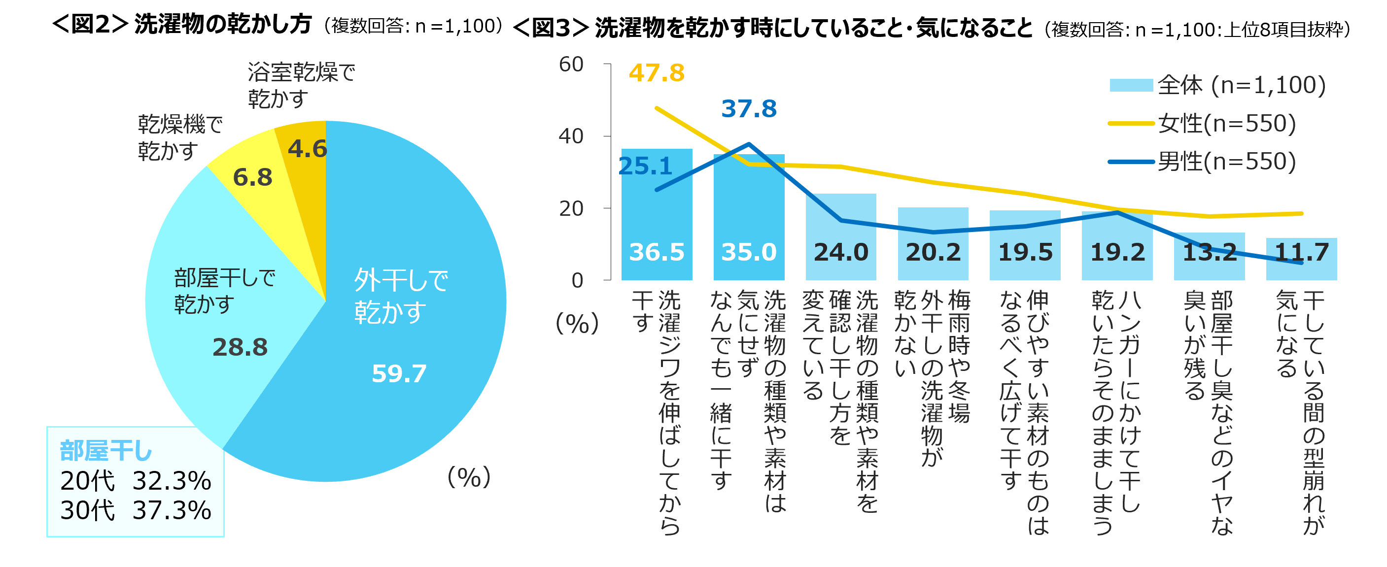 乾かし方は外干しが59.7%、部屋干しは28.8%。乾かす際は「洗濯じわを伸ばしてから干す」が36.5%。 年代別でみると20~30代で「部屋干し」と回答した割合が他の年代より高く、30代では37.3%と最も高い。<図2> 「洗濯じわを伸ばしてから干す」は女性は47.8%、男性では25.1%と、乾かし方についても男女差が見られた。<図3>