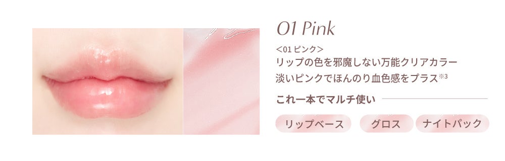 シリーズ内人気 No.1<01 ピンク>は、淡いピンクがほんのりと血色感をプラス(※3)するカラーで、リップベース、グロス、ナイトパックとしてマルチにご使用いただけることから長年愛され続けています。