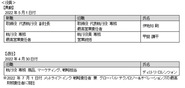 メットライフ生命保険株式会社(代表執行役 会長 社長 最高経営責任者 ディルク・オステイン)は、以下のとおり人事異動を決定しましたのでお知らせ致します。