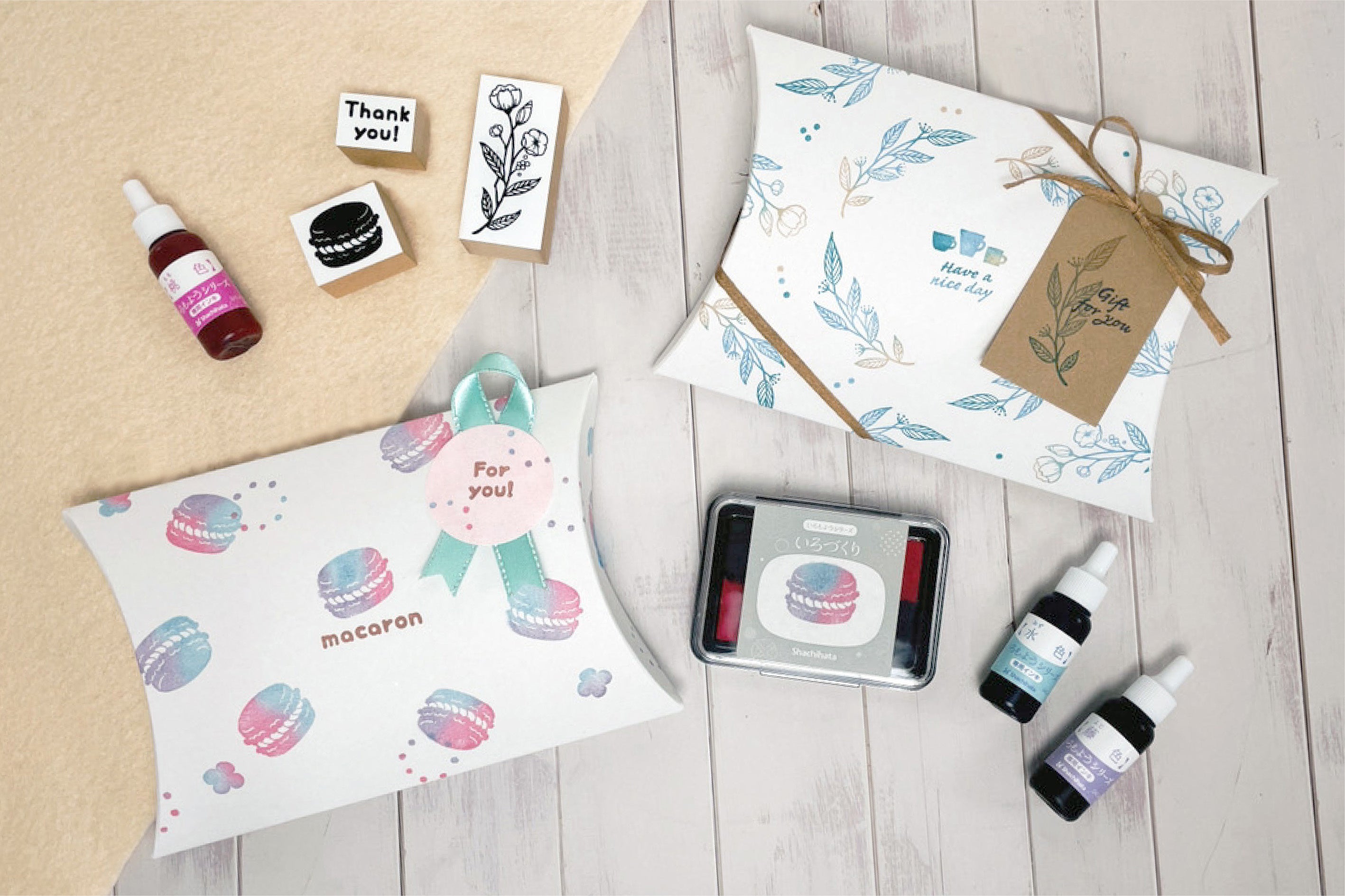 シヤチハタブースでは、自分で作るスタンプパッド「いろづくり」を使用したピローボックス作り体験が楽しめます。