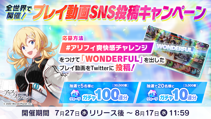 『アリスフィクション』の全世界同時リリースを記念して、最大「ガチャ100連分」のクォーツがもらえる「SNSプレイ動画投稿キャンペーン」を全世界同時開催いたします。