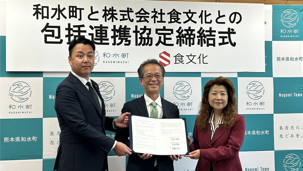 生鮮・グルメ食品のインターネット販売を主としてビジネスを展開する株式会社 食文化(東京都中央区築地、代表:萩原 章史)は、熊本県 和水町(なごみまち)と株式会社 食文化のそれぞれが有する資源を有効に活用し、地域課題の解決に向けた取組を推進するため、包括連携協定を締結いたしました。2024年5月16日、和水町の石原 佳幸町長と株式会社 食文化 萩原 章史社長の両名は、熊本県東京事務所の内藤 美恵所長の立ち会いのもと、東京都内において、包括連携協定締結式を行いました。