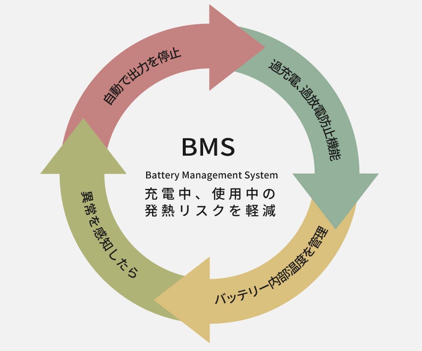 電子制御システム(BMS)を搭載したパナソニック、ヤマハ、ブリヂストンサイクルのバッテリーに対応する専用設計で、温度センサーが常に充放電温度を監視。異常を感知すると保護回路を作動させます。また、第三者検査機関と自社テストによるダブルチェックで、さまざまな機能性テストも実施済みです。
