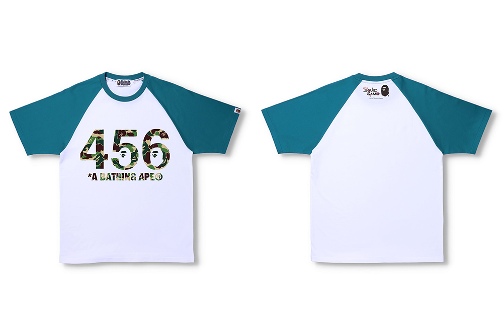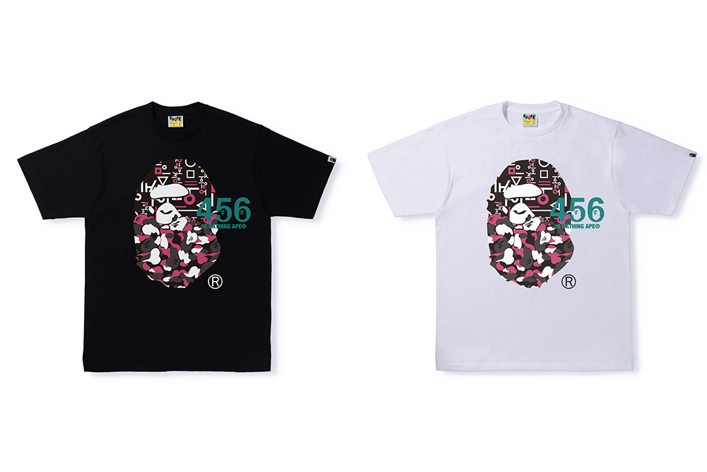 ブランドの象徴であるAPE HEADにタイトルのハングル文字が施されたデザインには、主人公の番号である「456」が落とし込まれている。また、劇中でゲーム参加者が着用するジャージにインスパイアされたTEEのフロントには ABC CAMO で「456」が配され、インパクトのあるデザインとなっている。ジャージを着用したBABY MILO®とマスクをつけたゲームの運営スタッフが並ぶシーンを描いたグラフィックのTEEも登場するなど、「BAPE®︎」と「イカゲーム」、双方の世界感を存分に味わえるコレクションに仕上がっている。