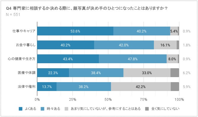 インターネットで、仕事やキャリア・お金や暮らし・心の健康や生き方・医療や体調・法律や権利などの専門家を探して相談したことがある551名に、専門家の顔写真について尋ねました。