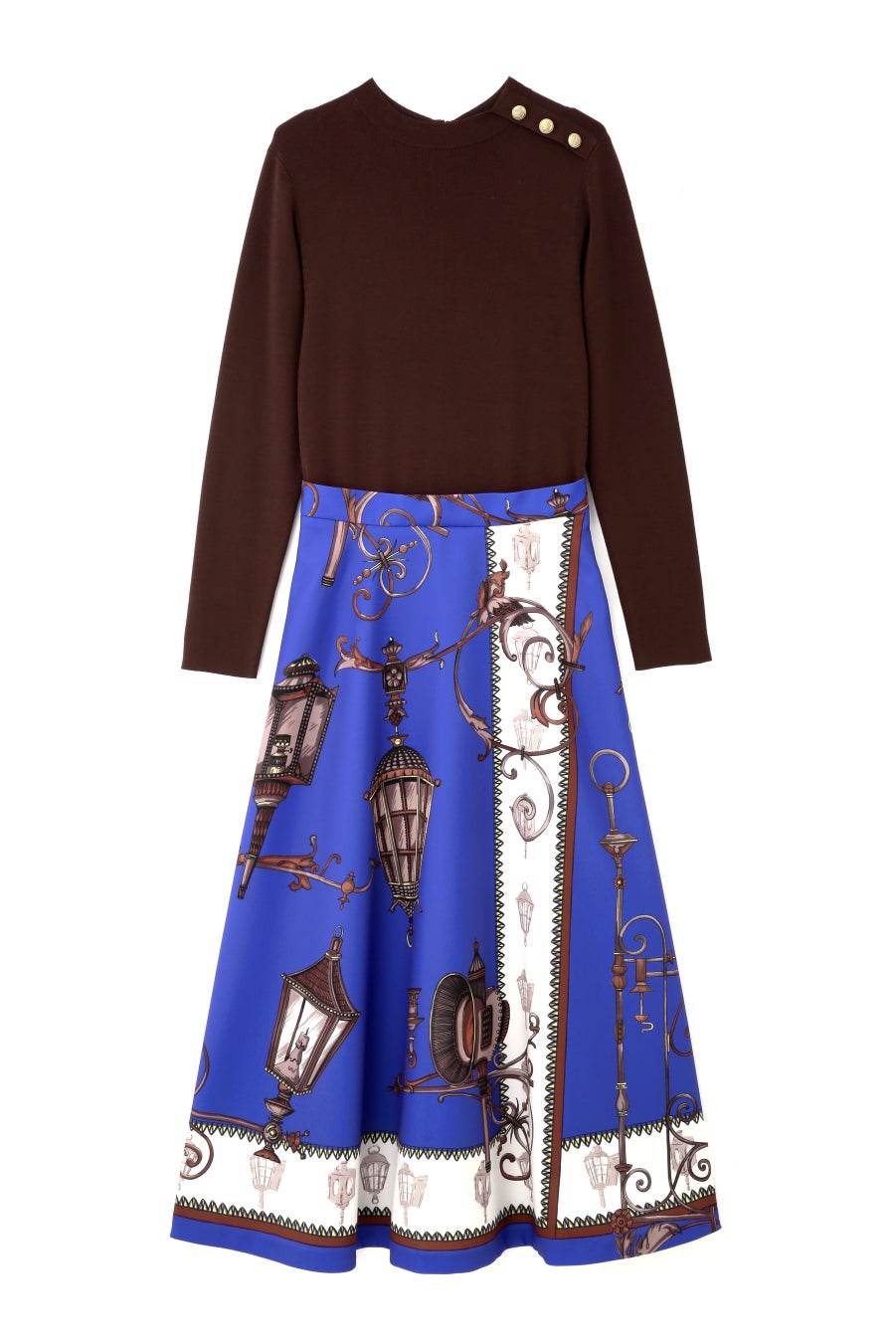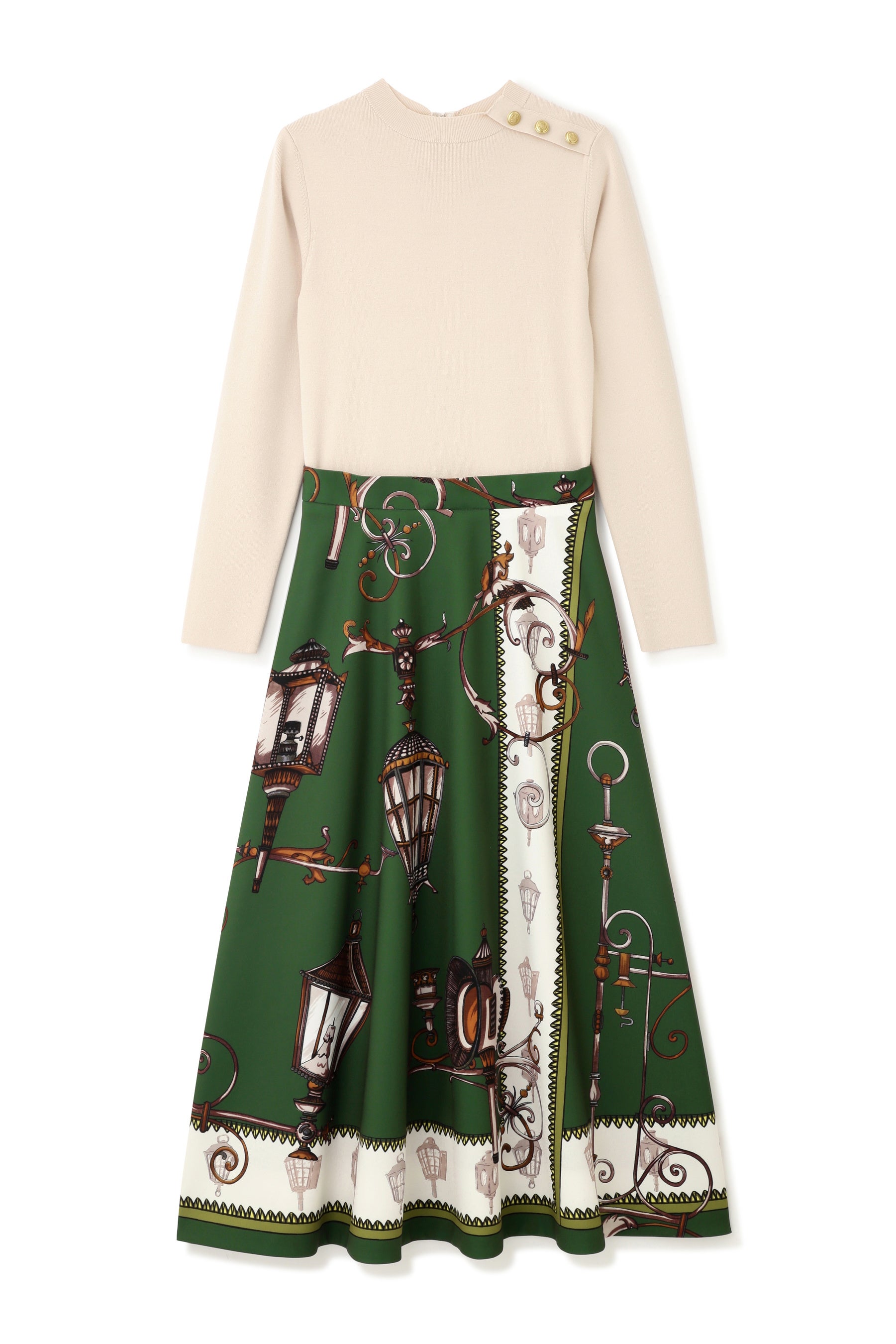 ランプモチーフがクラシカルな雰囲気のスカーフプリントワンピース。