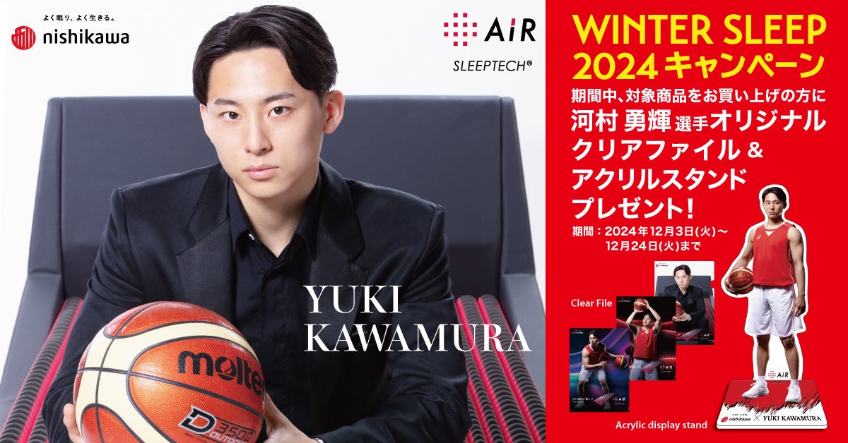 西川株式会社(以下nishikawa)は、寒い冬に向けて、プロバスケットボールプレイヤーの河村勇輝選手をイメージキャラクターに起用した「nishikawa WINTER SLEEP 2024 キャンペーン」を2024年12月3日(火)17時~12月24日(火)10時までの期間で開催します。本キャンペーンの対象店舗は、nishikawa公式オンラインショップとAmazon(※1)です。