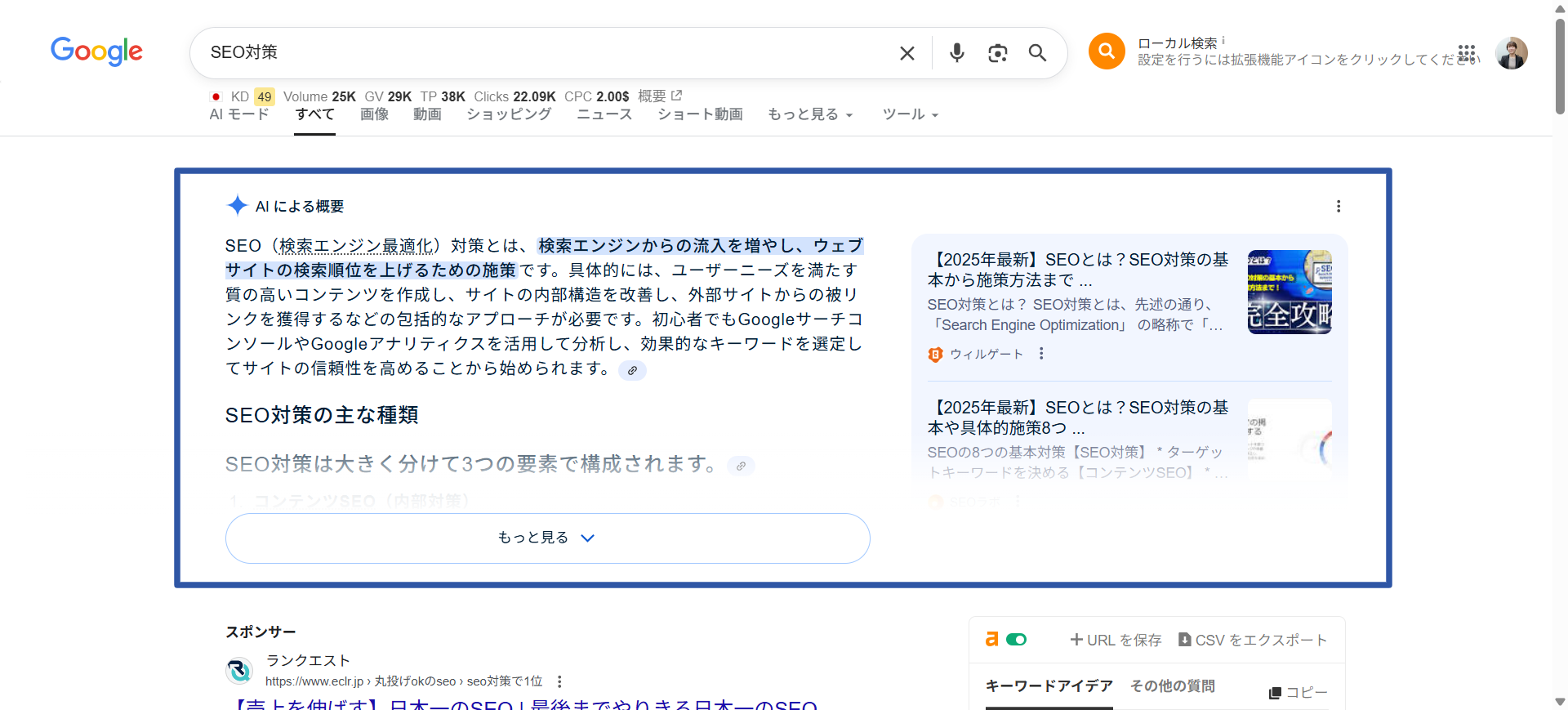 Google検索の結果画面上部に表示される、AIが生成した回答の概要です。ユーザーの検索意図に対して、複数のWebサイトから情報を引用し、AIが統合的な回答を提示します。従来の「検索順位1位」よりも目立つ位置に表示されるため、AI Overviewsに引用されることが、新たなSEO戦略の重要指標となっています。
