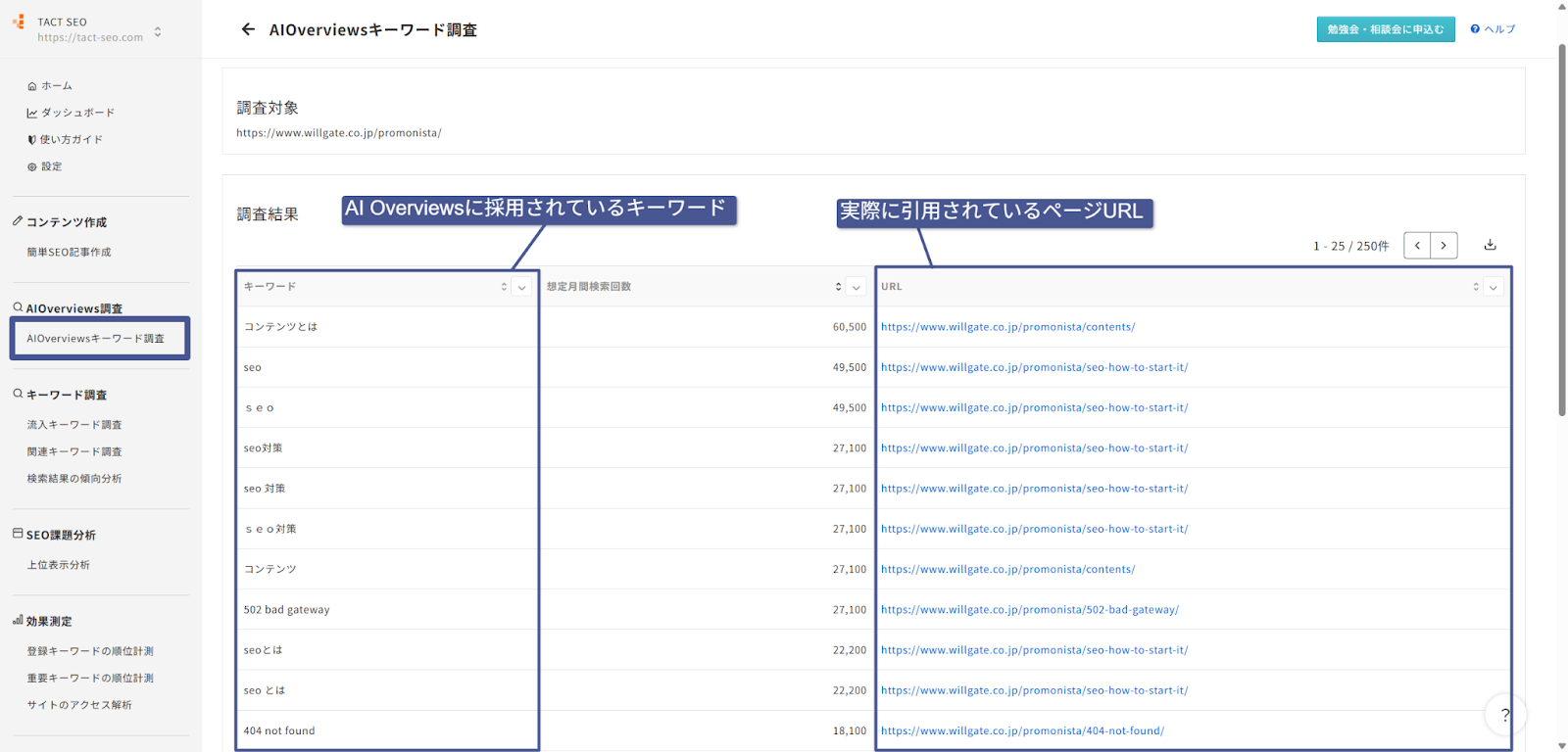 株式会社ウィルゲート(本社:東京都港区、代表取締役:小島 梨揮、以下「ウィルゲート」)が提供するAI×SEOツール「TACT SEO」は、AI Overviews(AIによる概要、略称:AIO)に採用されているキーワードを調査できる機能を新たに追加し、提供を開始したことをお知らせいたします。