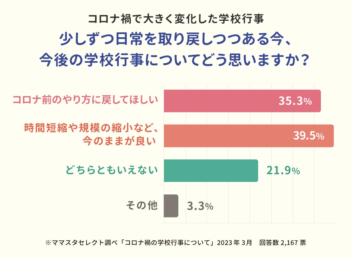 なお、「どちらともいえない」と迷いを抱える方からは、「子どもの成長を見られる機会は減らさないでほしいが、先生たちの負担を考えると良い面もある」と、現場の先生たちを思いやる声があがっていました。さらには、「コロナ前のやり方がいいとは限らない。内容を見直して無駄を省くべき」と、コロナ禍をきっかけに行事の精査を考えたママもいます。