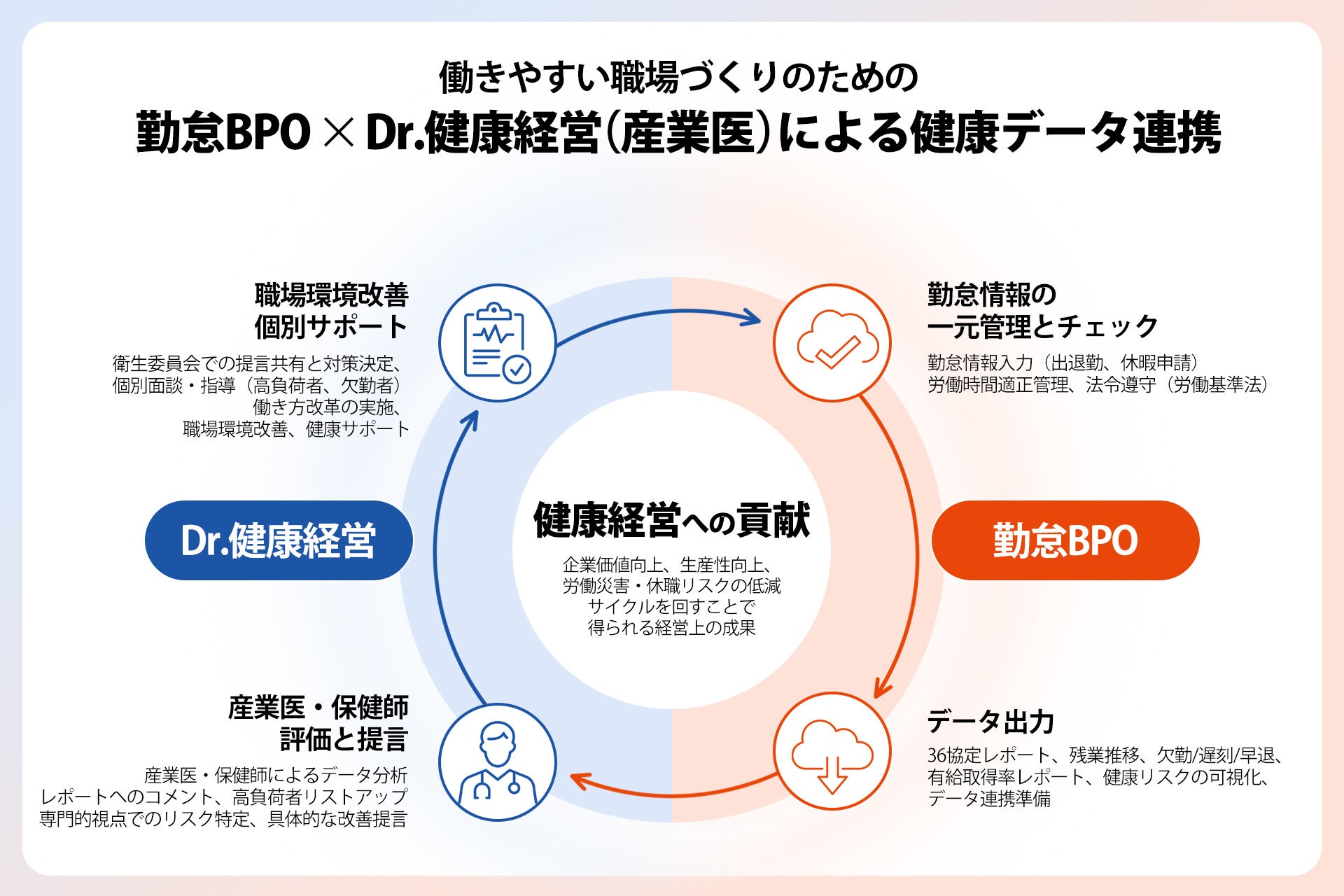 kubellパートナーが提供する「MINAGINE勤怠管理」の「勤怠BPOサービス」は、正確な勤怠データ管理と業務効率化をサポートし、Dr.健康経営は、質の高い産業医・保健師サービスを通じて企業の健康管理を支援しています。 この度、両サービスを連携することで、企業の勤怠データを産業医・保健師の知見に直結させ、「データに基づいた客観的なリスク分析」と「専門家による具体的な改善アドバイス」を融合した新たな健康経営支援体制を構築いたしました。