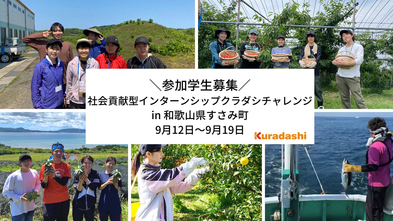 ソーシャルグッドマーケット「Kuradashi」を運営する株式会社クラダシ(本社:東京都品川区、代表取締役社長:関藤竜也、以下「クラダシ」)は、9月に実施が確定しました和歌山県すさみ町での社会貢献型インターンシップ「クラダシチャレンジ」の参加学生の募集を開始いたします。