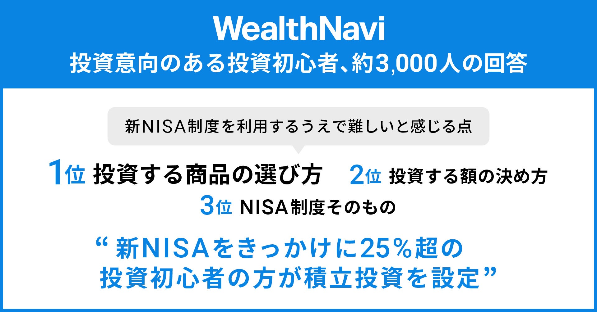 預かり資産・運用者数 国内No.1ロボアドバイザー(※1)「WealthNavi(ウェルスナビ)」を提供するウェルスナビ株式会社(本社:東京都渋谷区、代表取締役CEO:柴山和久)は、2024年から始まった新NISAに関する意識調査を実施し、全国の投資意向がある投資初心者約3,000人から回答を得ました。