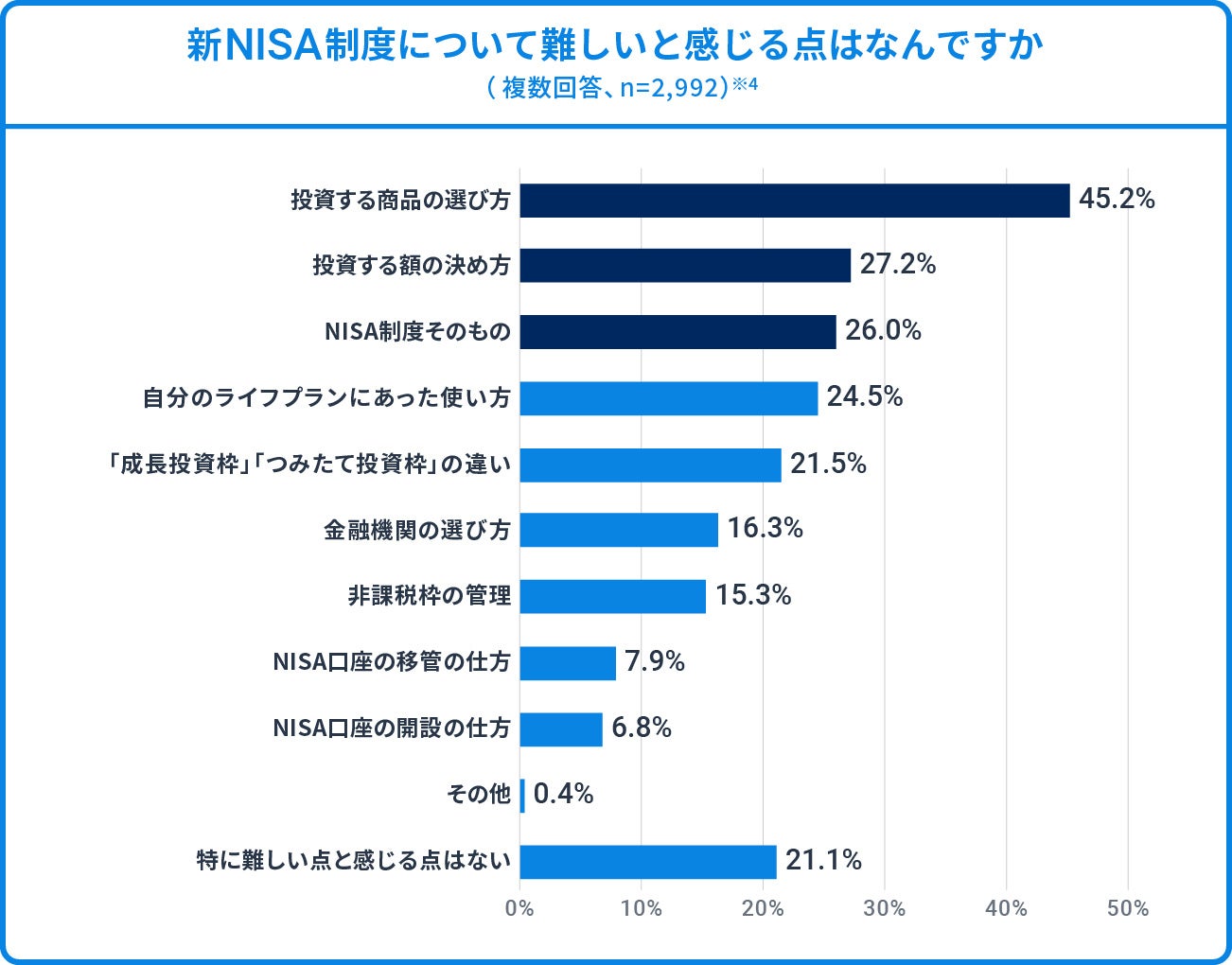 ※4 「新しいNISA制度について、あなたにとって利用するうえで難しいと感じる点はありますか。 あてはまるものをすべてお選びください。」への回答(複数回答、回答者数:2,992人、小数点第2位を四捨五入)