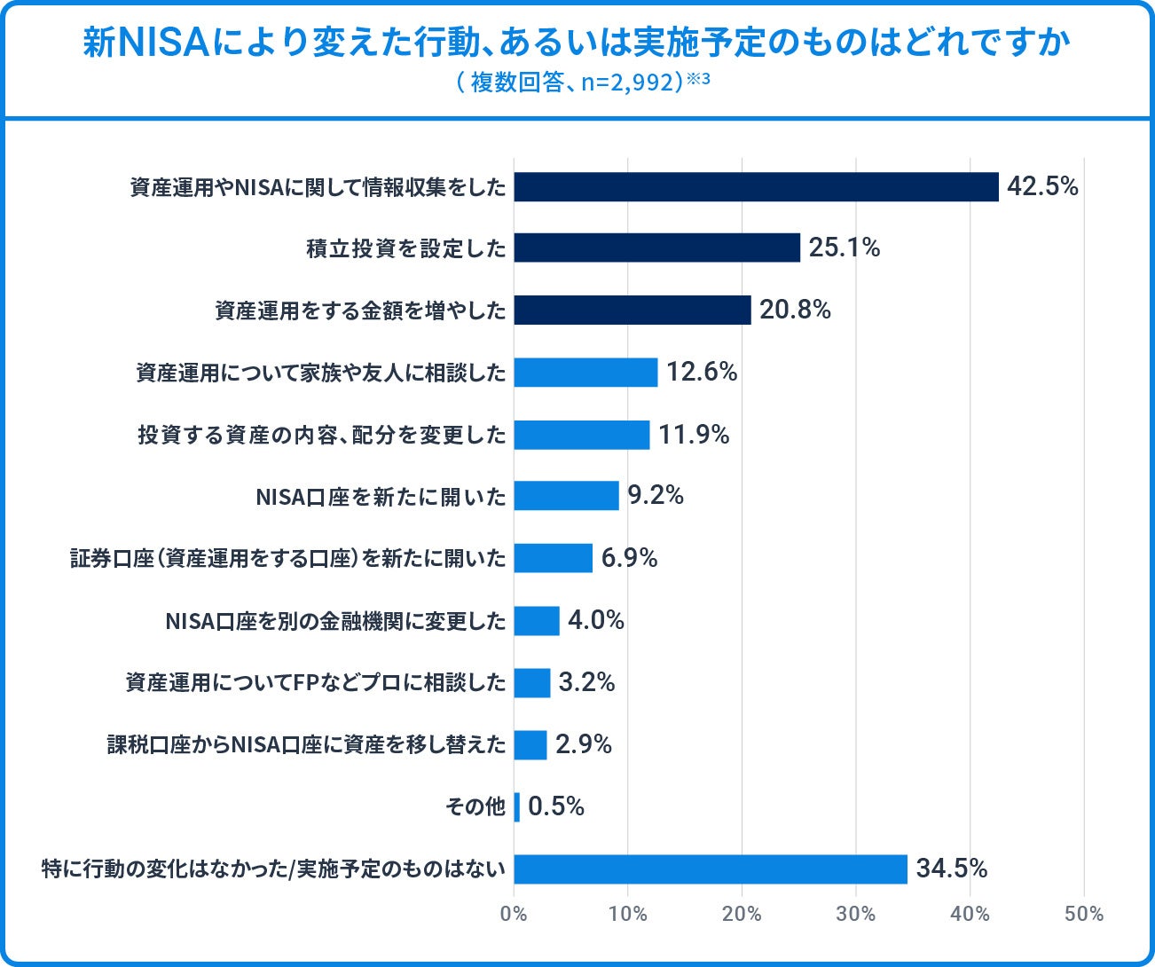 「新NISA開始に伴い『投資』に関する行動を変えましたか、あるいは概ね今後1カ月以内に変える予定がありますか」と質問したところ、最も多かったのは「資産運用やNISAに関して情報収集をした」で42.5%となりました。一方で「積立投資を設定した」が25.1%、「資産運用をする金額を増やした」が20.8%と回答しており、投資経験のある方は、新NISAの利用に向けて具体的な行動を起こしている様子が見て取れます(※3)。