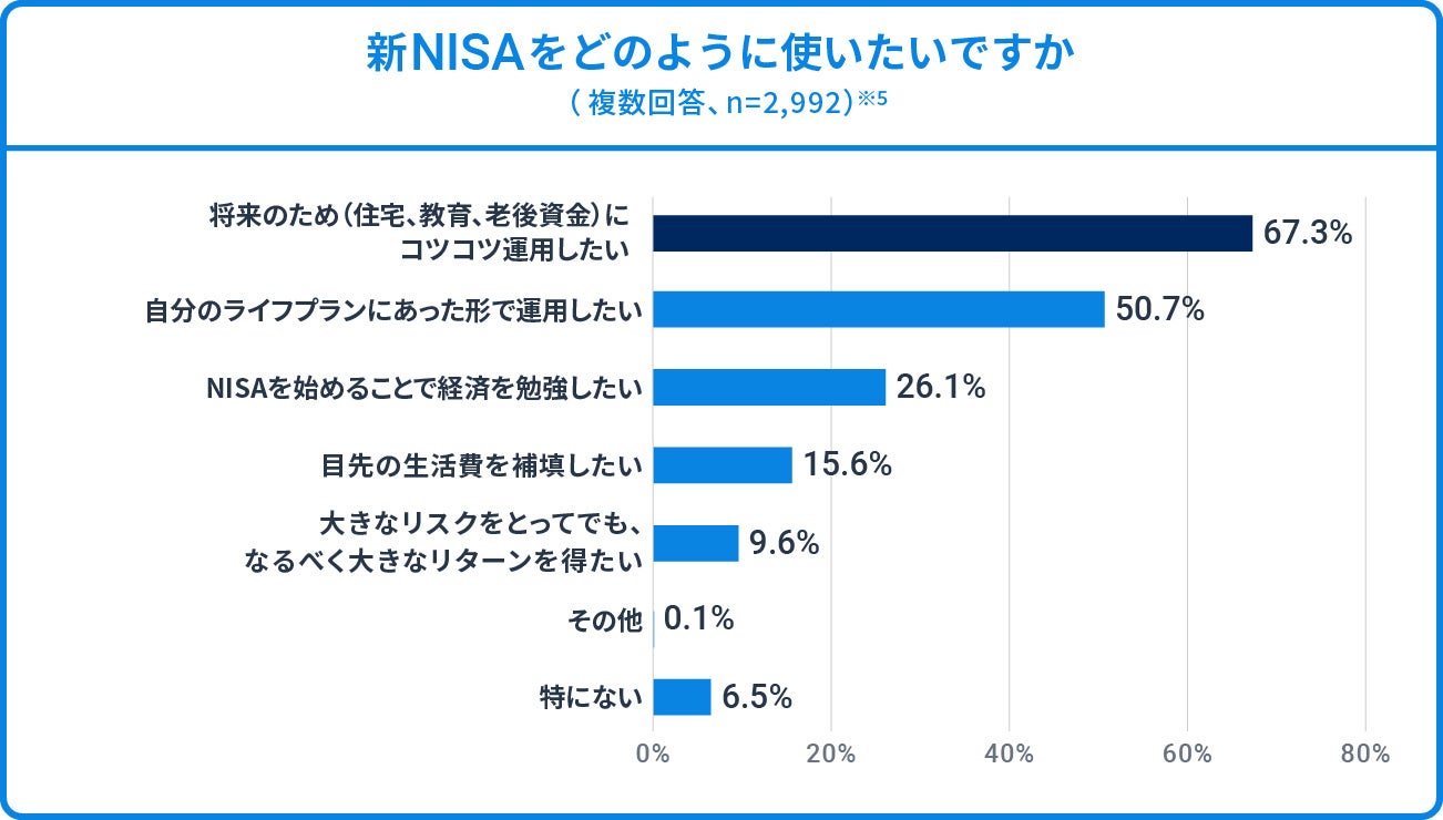 ※5 「あなたが新しいNISAを使う場合、どのように使えたらいいと思いますか。 あてはまるものをすべてお選びください。」への回答(複数回答、回答者数:2,992人、小数点第2位を四捨五入)