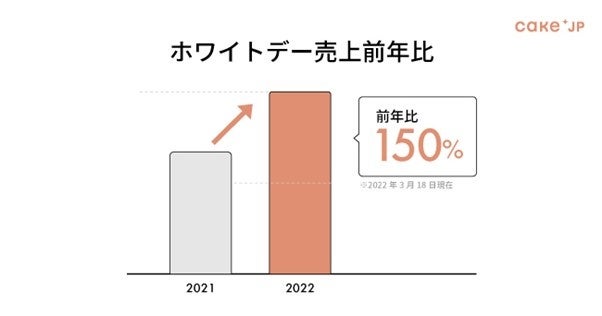 ケーキ・スイーツ専門通販サイト「Cake.jp(ケーキジェーピー)」を運営する株式会社Cake.jp(本社:東京都新宿区、代表取締役:高橋 優貴)は、2022年のホワイトデー商品の売上が前年比150%に達したことをご報告します。