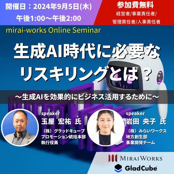 以下のURLよりお申込みください https://mirai-works.co.jp/business-pro/seminar/ai_reskilling0905 |