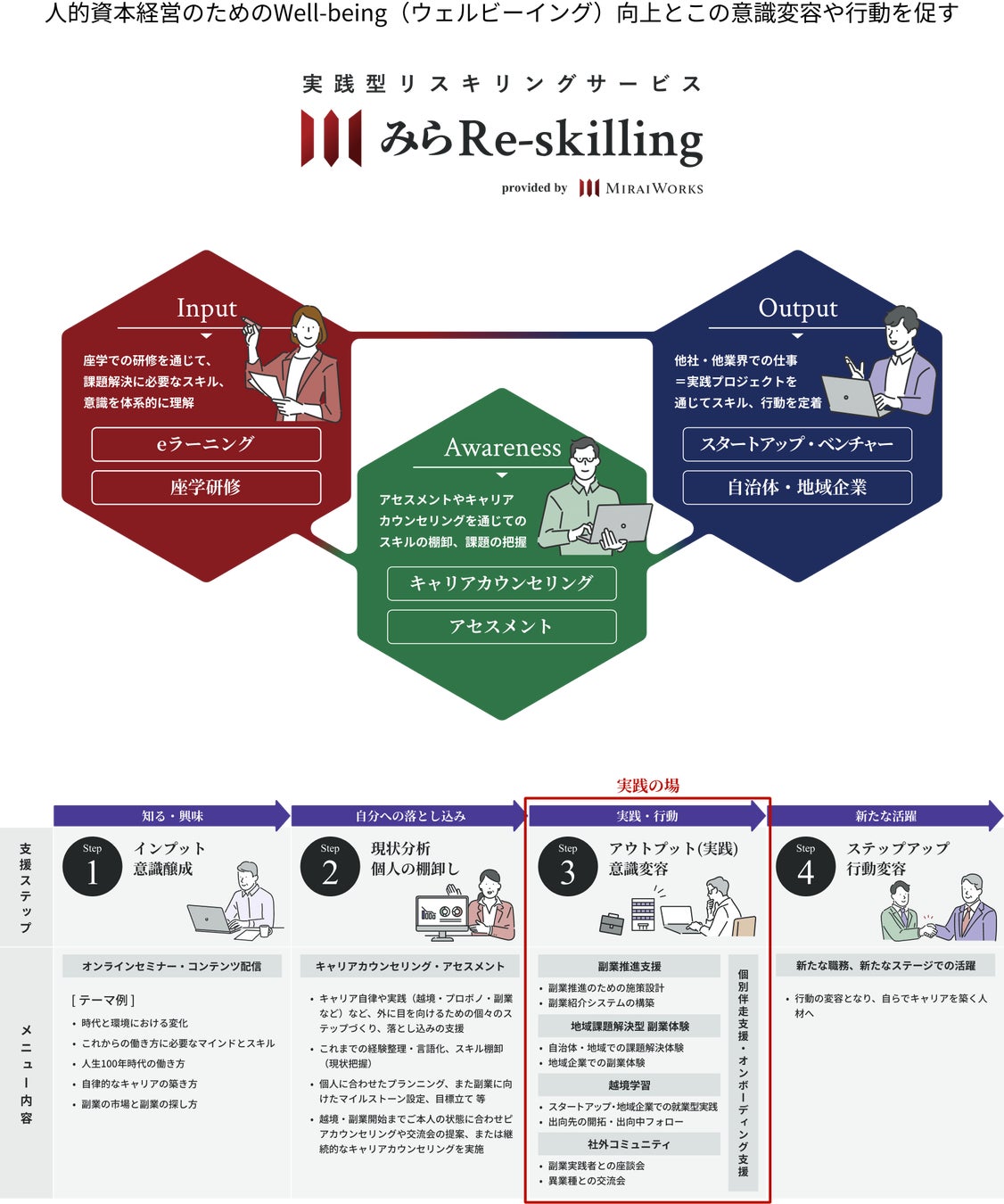当社は、人生100年時代に、プロフェッショナル人材がライフステージに応じて、「独立、起業、副業、正社員」といった働き方や「都市、地方」といった働く場所、働く目的(*1)に縛られない挑戦の機会提供とその挑戦の支援を行うための事業を展開しています。また、法人企業向けには、社員のスキルのアップデートやWell-being(ウェルビーイング)の向上、新しい人材活用の仕組みや制度を作るための実践型リスキリングサービス『みらRe-skilling』を提供し、企業の人的資本経営の施策として、効果的な実践型リスキリングの機会を、副業や越境教育を通じて提供しています。