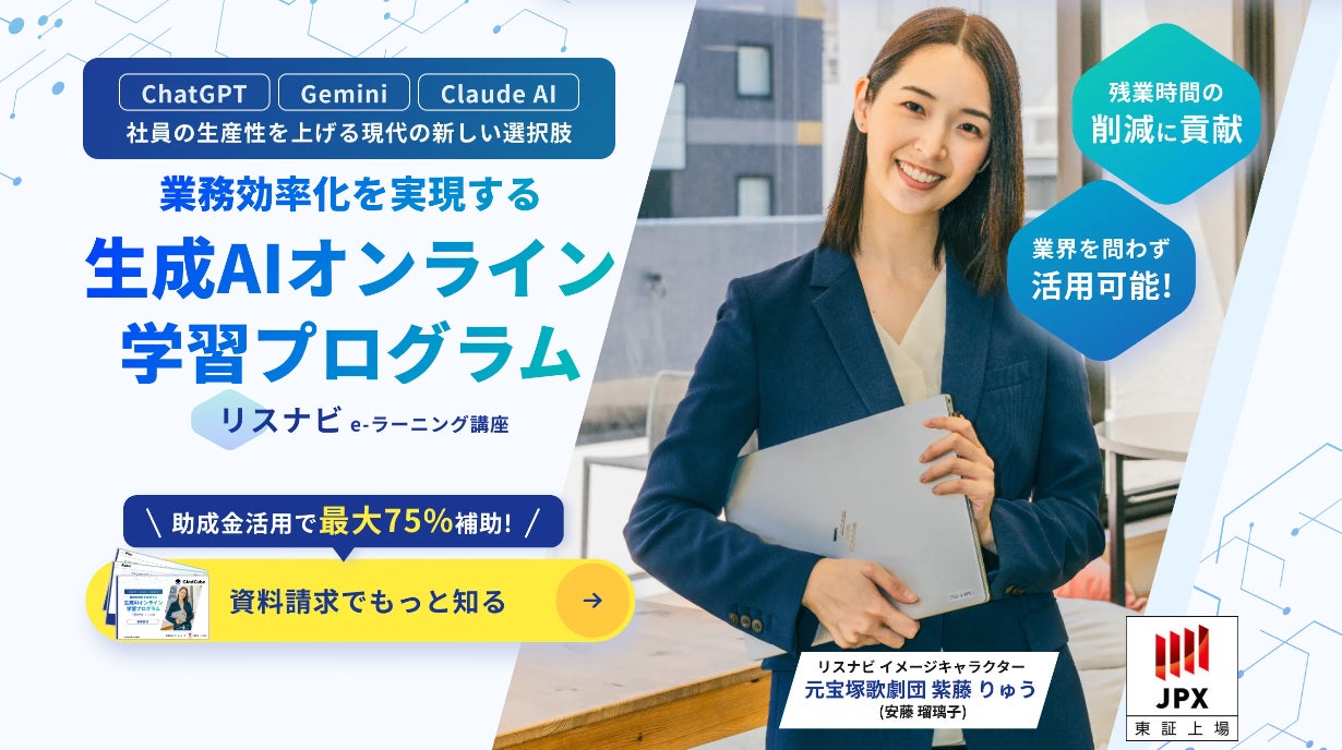 グラッドキューブが提供するデジタルマーケティングのリスキリングプログラムです。未経験者を最短3か月で即戦力のマーケターに成長させるプログラムを提供しています。デジタルマーケティング全般にわたるスキルだけではなく、最新技術やトレンドにも迅速に対応できるスキルを習得できるプログラムや「生成AI 」の学習プログラムも提供しています。プログラム修了後も講師によるサポートを通じ、受講者が常に最新の知識を得られる環境を提供し、『リスナビ』の修了生が業界で通用するスペシャリストとして認知されるよう、高い専門性を持った人材を育成します。