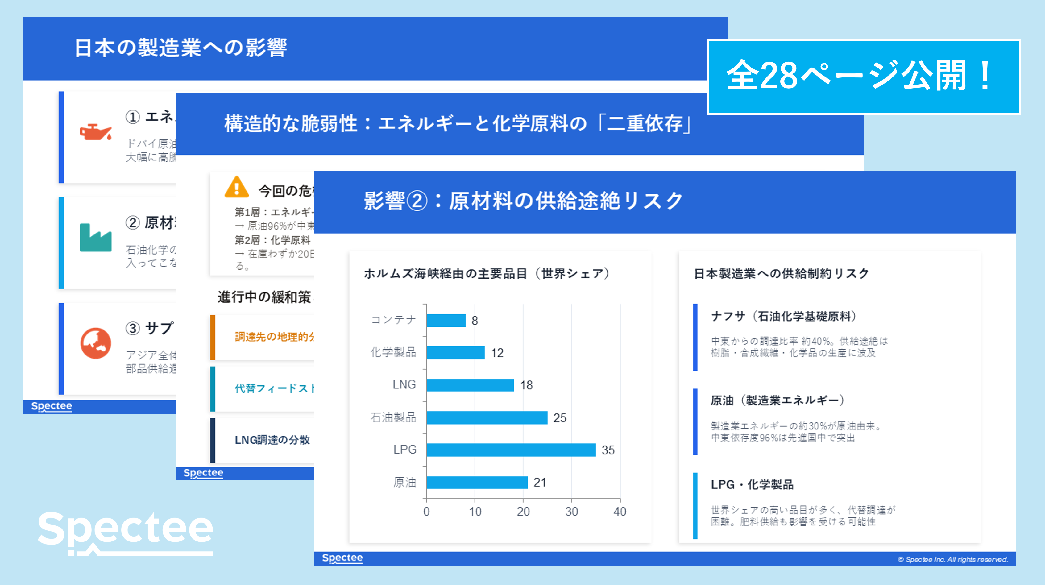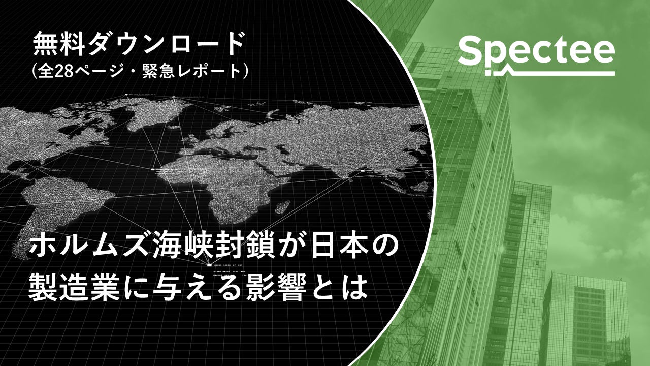 製造業向けにサプライチェーンリスク管理サービスを提供する株式会社Spectee(本社:東京都千代田区、代表取締役CEO:村上建治郎、以下「Spectee」)は、ホルムズ海峡の事実上封鎖が日本の製造業サプライチェーンに与える多層的な影響を独自に分析・整理したホワイトペーパー「ホルムズ海峡封鎖が日本の製造業に与える影響とは―地政学リスクから読み取る製造業サプライチェーンのレジリエンス戦略」を無料公開いたしました。(※尚、本レポートは4月5日時点で作成されたものです。その後の変化を反映していない場合がございます。)