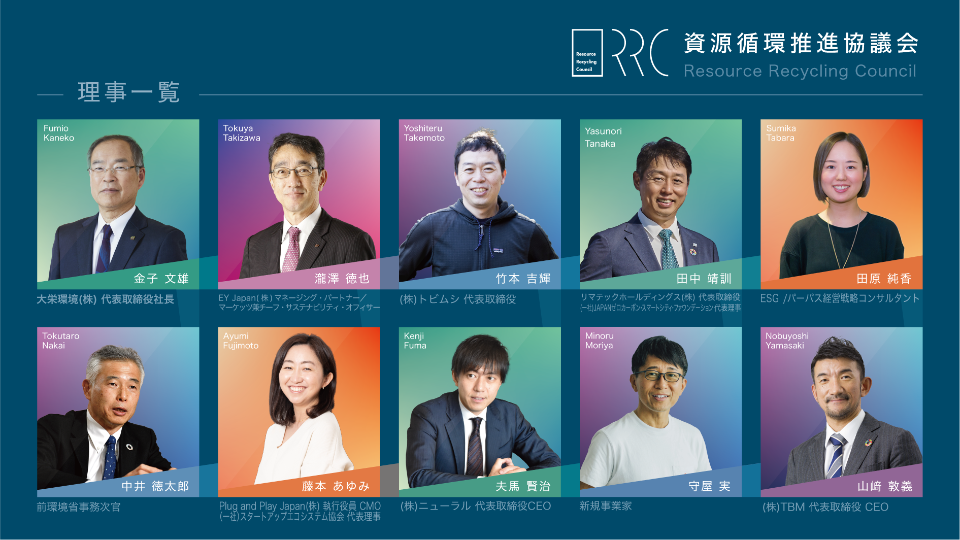 一般社団法人 資源循環推進協議会の理事メンバーには、環境行政や資源循環関連のルールメイキングで最前線に立つ実務家、動静脈産業の中核を担う主要企業トップ、新産業やスタートアップの創出支援やサステナビリティ経営に携わるプロフェッショナルなど、サーキュラーエコノミー領域、サステナビリティ、スタートアップ領域で幅広く活躍するキーパーソンが集いました。運営にあたってはTBMが事務局を担います。