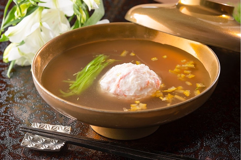 「かに真丈~柚子の香りの餡仕立て~」。自家製のかに真丈に香り高い柚子の餡を掛けた正統派和食。とろみのある餡が体の芯から温めてくれる冬ならではのご馳走です。