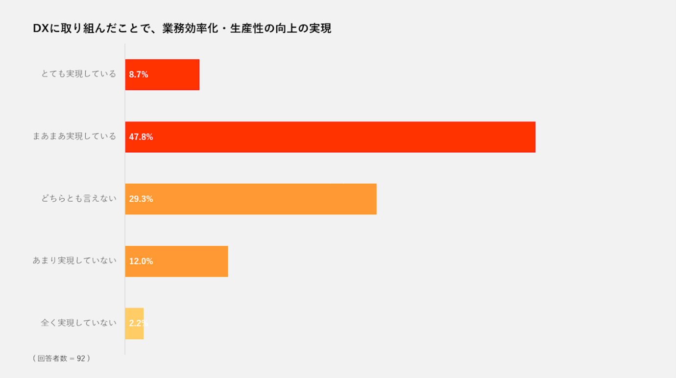 「DX推進によって業務効率化・生産性向上が実現したか」という質問に対して、とても実現している・まあまあ実現している、をあわせると「実現している」という意見は56.5%に上りました。