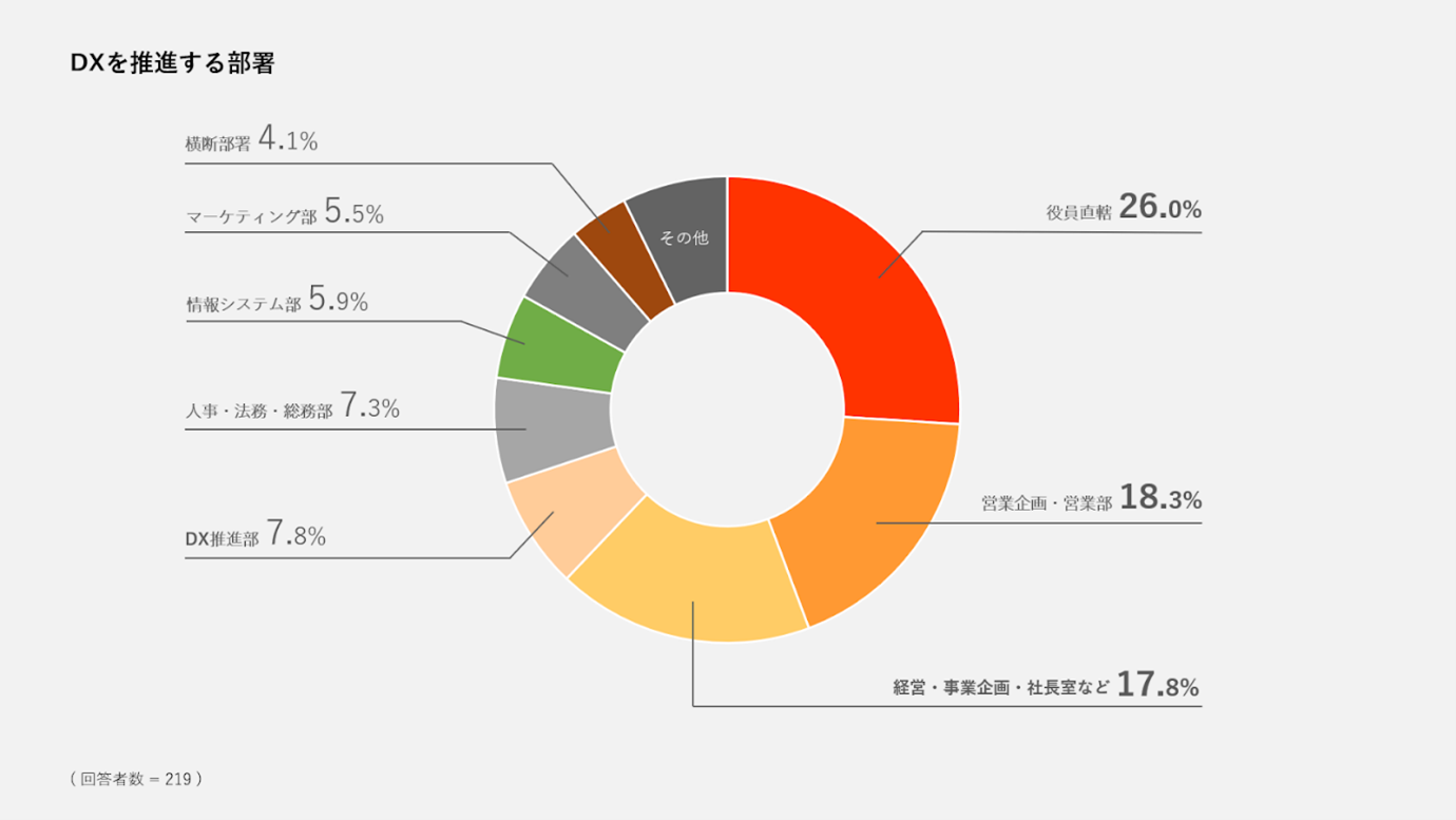 DX推進の担当部署について質問したところ、「役員直轄」が最も多く26.0%で、次いで18.3%が「営業企画・営業部」、17.8%が「経営企画・事業企画・社長室」と回答しました。また「DX推進部」という専門部署があり、そこが担当しているというケースも7.8%ありました。