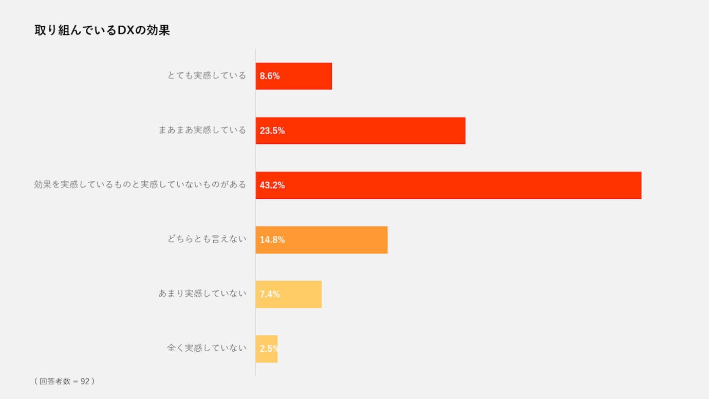 また、DXの効果について質問したところ、「とても効果を実感している」・「まあまあ効果を実感している」・「効果を実感しているものと実感していないものがある」、をあわせると「効果を実感している」という意見が75.3%になりました。