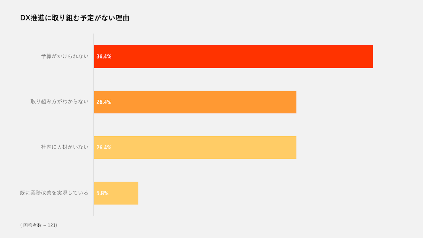 また、「DXに取り組む予定がない」と回答した企業に「取り組む予定がない理由」を確認した質問でも、「予算の確保」「取り組み方がわからない」「DX人材の確保」が課題となっていることがわかりました。