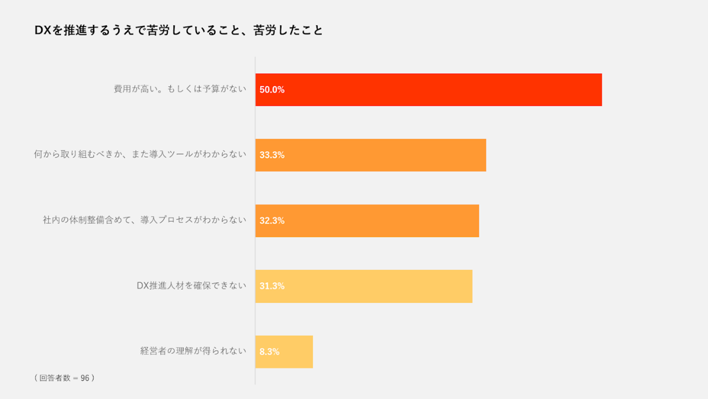 「DXを推進するうえで苦労していること(苦労したこと)」を質問したところ、「予算の確保」「DX人材の確保」「(社内体制整備含め)導入プロセスがわからない」の3つがいずれも30%以上となりました。