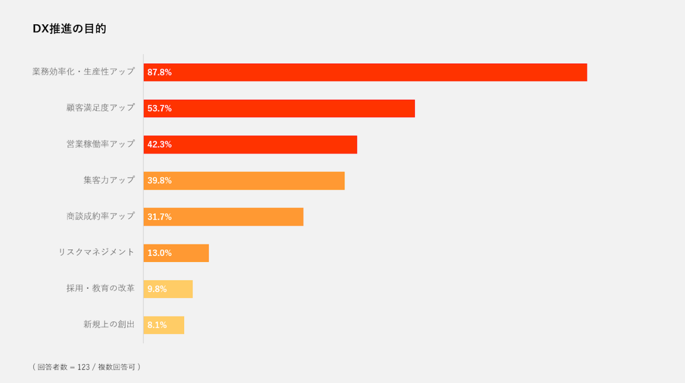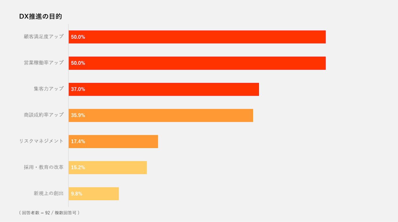 DX推進の目的について質問したところ、「顧客満足度アップ」「営業稼働率アップ」が50.0%と最も多く、次いで「集客力アップ」が37.0%の回答となりました。