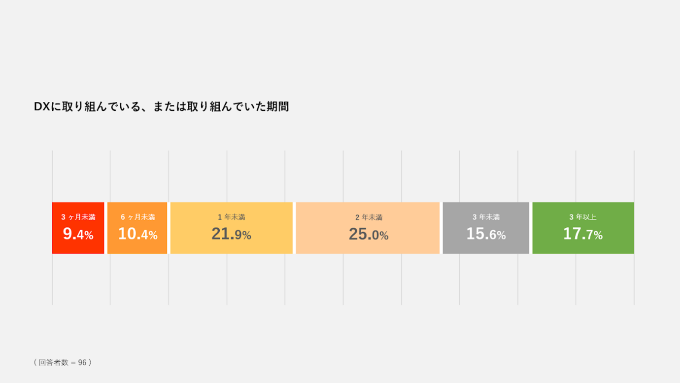 「3ヶ月未満」「6ヶ月未満」含む直近1年以内でDXの取り組みを開始した企業は41.7%で、大きく増加したことがわかります。