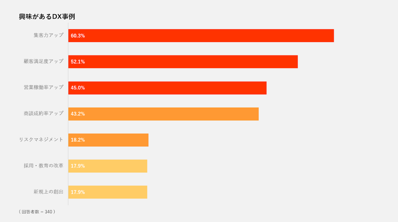 また、全ての回答者に興味があるDXの取り組み事例を質問したところ、60.3%が「集客力アップ」、52.1%が「顧客満足度アップ」、45.0%が「営業稼働率アップ」、43.2%が「商談成約率アップ」と回答。営業マーケティングのDX事例に興味を持たれる方が多いことがわかりました。