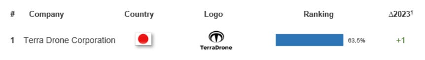 Terra Drone株式会社(本社:東京都渋谷区、代表:徳重 徹、以下 テラドローン)は、世界的なドローン市場調査機関であるDrone Industry Insights(ドローンインダストリーインサイツ、以下 DRONEII)が発表した「ドローンサービス企業 世界ランキング2024」において、産業用ドローンサービス企業として世界1位を獲得しました。テラドローンが本ランキングで1位を獲得するのは、2020年以来4年ぶりで2度目になります。