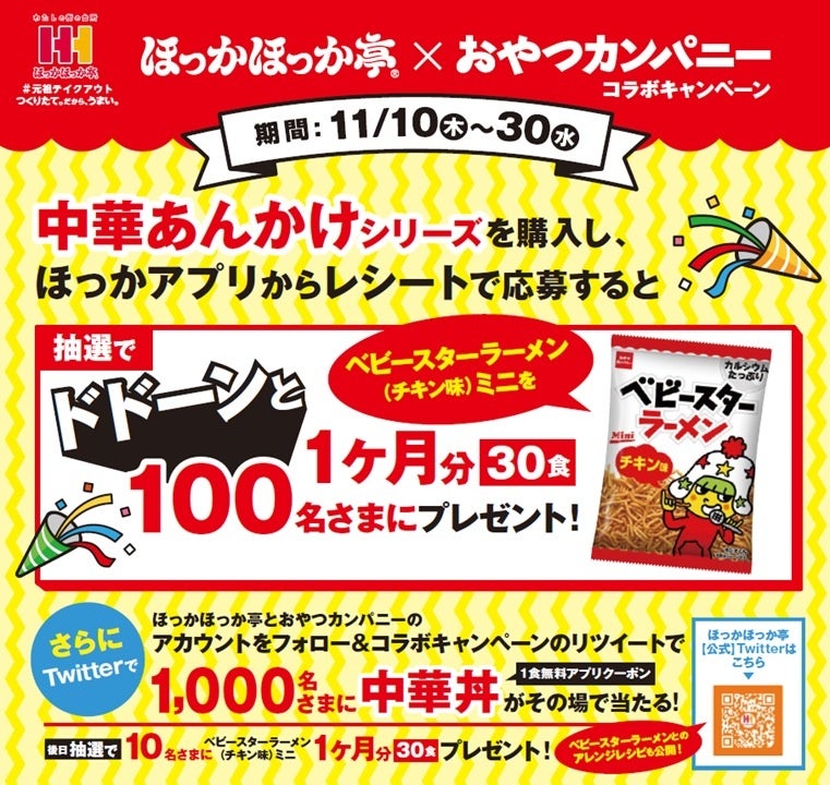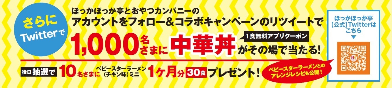 「ほっかほっか亭(@HokkahokkaP)」とおやつカンパニー(@BABYSTAR_OYATSU)の公式Twitterアカウントの両方をフォローし、ほっかほっか亭公式アカウントの対象となるコラボキャンペーン投稿をリツイートすると抽選で1,000名様に「ほっかほっか亭」中華丼1食無料アプリクーポンがその場で当たります。さらに、後日抽選で10名様にベビースターラーメン(チキン味)ミニ・1ヶ月分(30日分)をプレゼント。