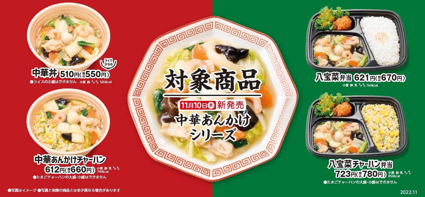 対象商品:中華あんかけシリーズ(中華丼/中華あんかけチャーハン/八宝菜弁当/八宝菜チャーハン弁当)