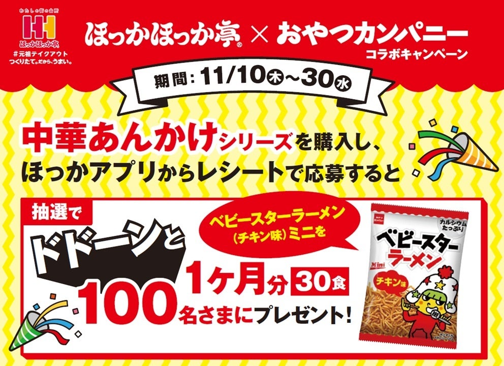 「ほっかほっか亭」中華あんかけシリーズを購入したレシートで「ほっかほっか亭」公式アプリ「ほっかアプリ」からご応募いただくと、抽選で100名様にベビースターラーメン(チキン味)ミニ・1ヶ月(30食分)をプレゼント。