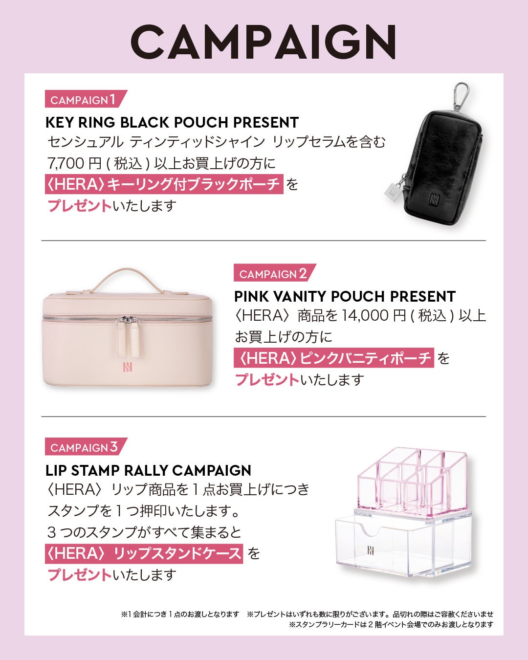 条件:ポップアップイベント会場でお配りするカードを持って、3階 HERAカウンターへご来店の方