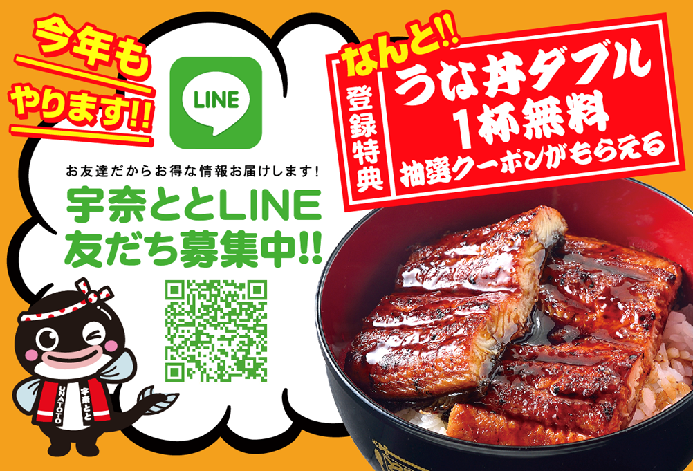 LINE公式アカウントをすでに友だち登録している方・期間中に友だち登録していただいた方を対象に、栄養満点の鰻が2枚のった人気No.1メニュー「うな丼ダブル」の無料クーポンが抽選で当たります!