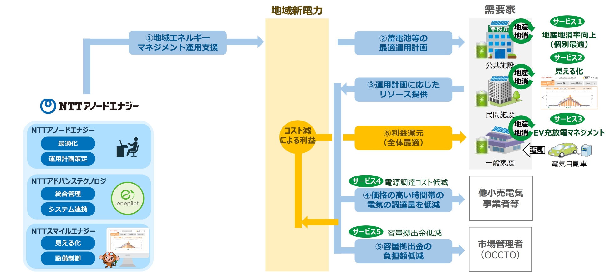 この障壁を乗り越えるため、NTTアノードエナジー、NTTスマイルエナジー、NTTアドバンステクノロジの三社は、各社のノウハウやソリューションを組み合わせ、地域内に点在するエネルギー資源を統合的に管理し、それらを効率的に運用することで、市場価格の高い時間帯に調達する電力量の低減や、ピークシフトによる容量拠出金の負担低減など、各施設の太陽光発電の電力を余すことなく地産地消させるだけでなく、地域全体での経済性向上も同時に実現する「地域エネルギーマネジメントサービス」の提供に向けた実証試験を共同で開始しました。