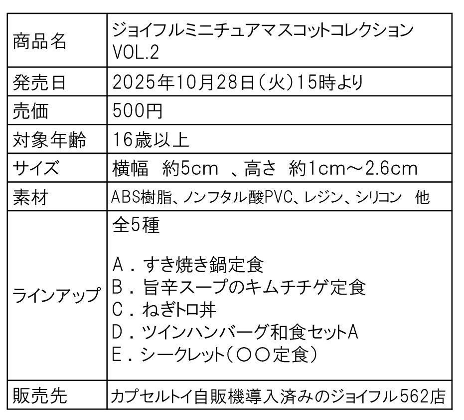 ファミリーレストランのジョイフル(本社:大分県大分市 代表取締役社長:穴見くるみ)は、ジョイフルの人気メニューをミニチュア化した「ジョイフルミニチュアマスコットコレクションVOL.2」(1回500円、全5種)を、カプセルトイ導入済みのジョイフルにて数量・店舗限定で販売を開始しました。