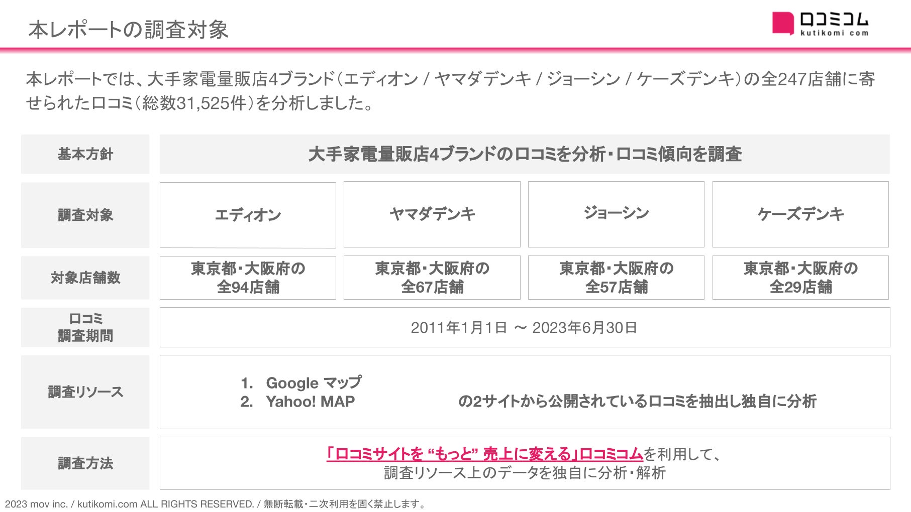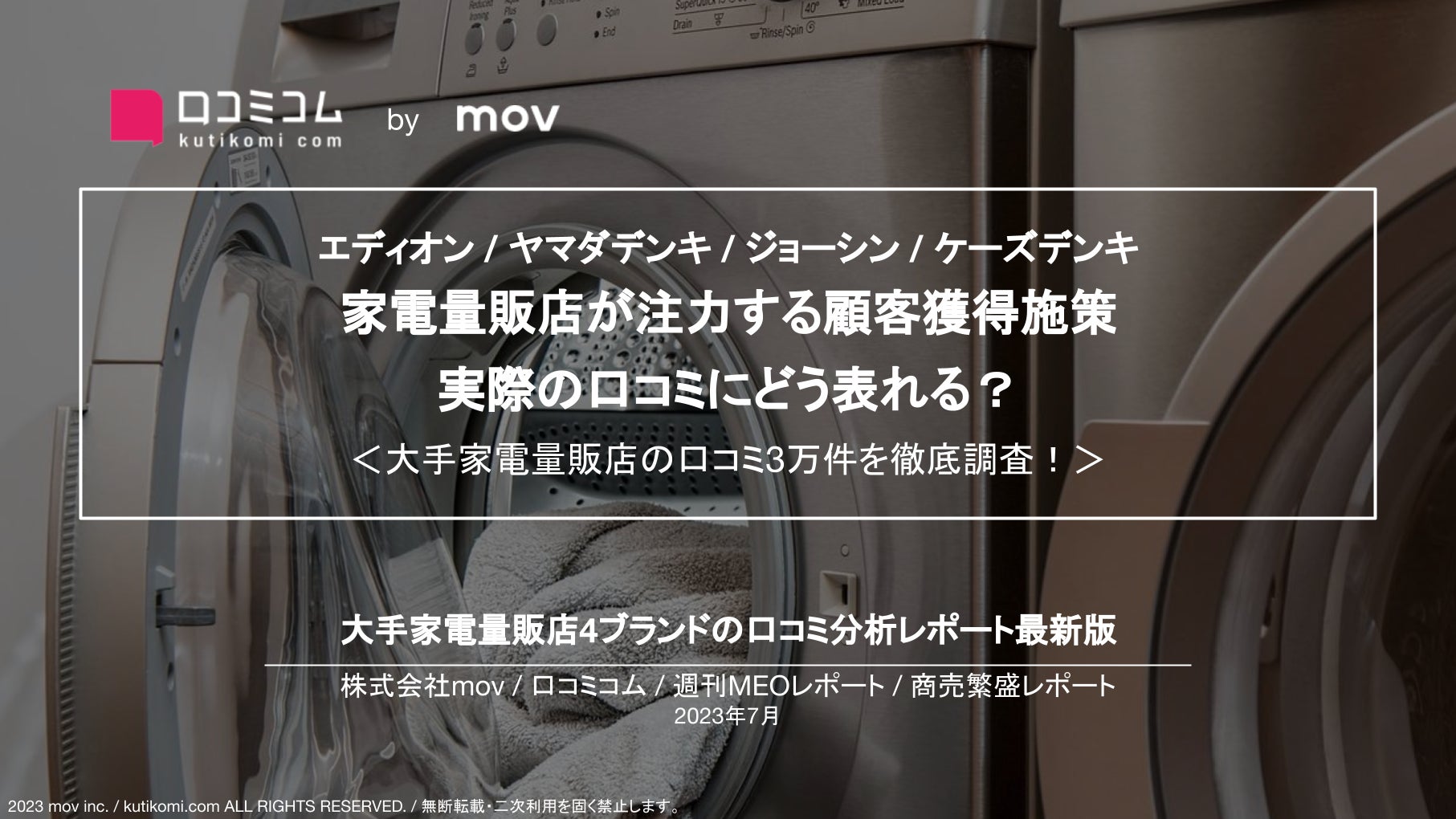 今回は、大手家電量販店4ブランド(エディオン / ヤマダデンキ / ジョーシン / ケーズデンキ)に寄せられた約3万件の口コミを調査、比較検証をしました。